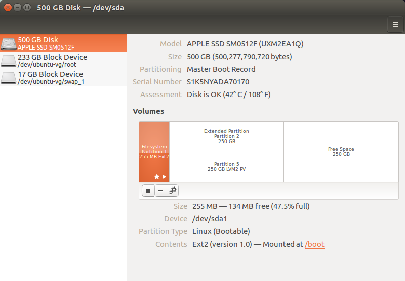 之前安装 Ubuntu 的时候,系统盘是那块三星的 250GB 840 EVO,当时不知怎么想的,把 LVM 启用了,在后续的使用中也并没有感觉到和传统的分区方式有什么不同。前些时,发现 250GB 的容量逐渐不够,就把整盘克隆到了 MacBook Air 里,因为后者的 SSD 高达 500GB,心想可以在必要时进行扩容,这种操作对于电脑达人三太爷来说并非首次。