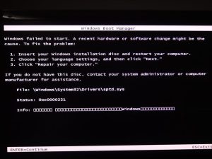 用错误码 0xc0000221 以及相关的错误信息搜索出来的案例,跟遇到的真实情况有一个巨大的差别,那就是别人在遇到 0xc0000221 时,上面多出来一行信息,其中会清晰指出是哪个文件的校验和有问题,如这样(网图,非常相似,不过它的 Info 部分反而是其它语言,导致显示异常):
