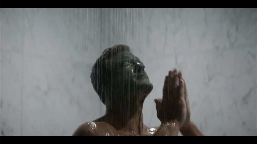 男主这个画面看上去很像是在祈祷,其实并不是。这是他孤身一人以迷彩着装和扮相在一栋住宅内外手刃五名凶徒后回到住处淋浴的场景,这个动作只不过是要举手抹掉脸上的涂装而已。如果你有跟老夫一样的前面的错觉,那就对了,毕竟是有意的。