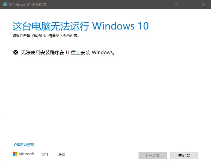 Windows 10 的 2004 版本,正式推送开始也不短时间了,ThinkPad X200 上的系统里多次检查,也迟迟没有。于是下载了易升,让它来协助。最开始的检查通过之后,突然显示了个“不能在 U 盘上执行升级”的信息。