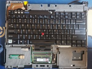 不过还是缺个比较重要的东西:防滚架。这个玩意儿是 ThinkPad 当年的骄傲,尽管不需要通电,却是物理稳定性的核心部件。在网上看到了人在卖配件,明明有防滚架可是没有标价格,一问才知道他的防滚架出了问题,有断裂的地方,不过估值五块钱的话,还是可以试试的。接下来就是运费问题,一般来说,运费高于货款的买卖我是不做的。为了摆平这个局面,我又把他的掌托(不带触控板和指纹)、D 壳、散热器、键盘、一条 2GB 内存也一起盘了回来。可这样一搞,明显就是豆腐盘成了肉价钱,一共花了六十大洋。如果有耐心的话,这个价格就快要能搞定一个完整带主板的下半身了。